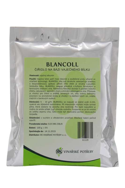 Vyhody registrácieVaječný bielok patrí medzi klasické a osvedčené prvky používané vo vinárskej technológiu. BLANCOLL vďaka svojej štruktúre zabezpečuje jednoduchú a bezproblémovú aplikáciu, číriaci efekt je zhodný s použitím čerstvého bielku. BLANCOLL reaguje prevažne s horkými fenolovými a tanínovými zložkami vína. Pri následnej Flokulácii dochádza k posilneniu čistiaceho efektu, zaoblenia a zjemnenie chuti. Prípravok je vhodný pre čírenia a zvlášť červených vín, vďaka svojmu šetrnému pôsobeniu na aromatické zložky je vhodný aj na ošetrenie bielych vín, osobitne zrejúcich v barikových sudoch. Priemerná doba sedimentácie: 2-3 dni.