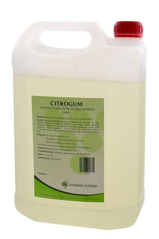 Použitie: Prípravok citrogum je určený na aplikáciu do hotových vín. Vďaka dokonalej úprave je možné ho pridávať pred finálnou filtráciou. Posilňuje bielkovinou stabilitu vín. V spojení s kyselinou metavinou chráni pred vypadaním vínneho kameňa. U červených vín zabraňuje zrážaniu a usadzovaniu farbivá. Ďalej podporuje a posilňuje organoleptické vlastnosti vína.