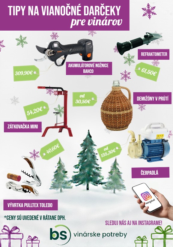 Máte v rodine vinára a neviete, čo mu kúpiť pod vianočný stromček ? Či priateľku alebo sestru ktorá má rada dobrú fľašu vína ? V našej ponuke nájdete rôzne produkty ktoré potešia či už hobby alebo aj profi vinárov. Môžete sa nechať inšpirovať našim výberom alebo siahnuť po niečom podľa vlastného výberu napríklad:Vianoce sa blížia a my sme si pre Vás pripravili niekoľko tipov na vianočné darčeky pre vašich blízkych.