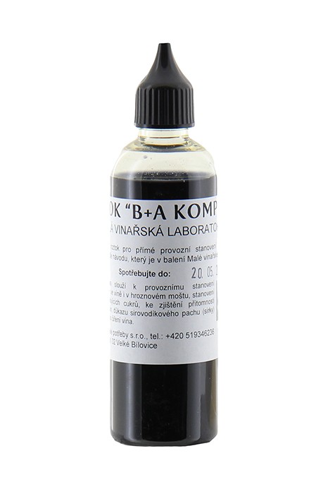 - Dávkovanie roztoku "B+A komplet" ukončíme práve vo chvíli, kedy sa u bielych vín obsah skúmavky zmení na svetlo modrý až nafialovelý odtieň, u červených vín proti bielemu pozadiu (stena miestnosti) obsah z černie a stane sa nepriehľadným. Táto farebná zmenu musí vydržať aspoň 30 sekúnd. V inom prípade je nutné do skúmavky pridať niekoľko kvapiek roztoku "B+A komplet"