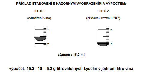 - Od zaznamenanej číselnej hodnoty odčítame číslo 10. Výsledok udáva koľko g titrovateľných kyselín je v jednom litri skúšaného vína.