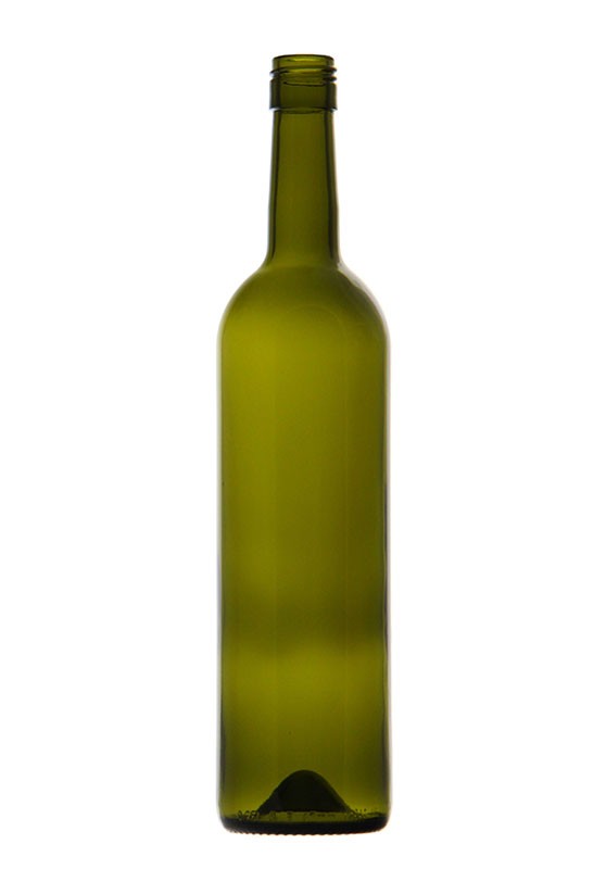 Sklenená fľaša na víno typu bordeaux. Určená pre uzavretie skrutkovacími uzávermi.