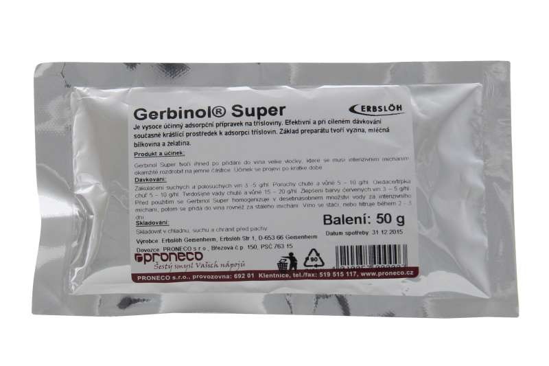 Vyhody registrácieGERBINOL SUPER je efektívny a pri cielenom dávkovaní súčasne krášliaci prostriedok k adsorpcii trieslovín. Základ preparátu tvorí špeciálne bielkoviny, mliečna bielkovina a želatína s vysokým stupňom Bloom. Cieleným výberom sa dosiahlo toho, že GERBINOL SUPER nezostáva vo víne a je teda vhodný k poslednému číreniu pred plnením. Korektúry sezónnych pachutí, nekontrolovateľne vznikajúcich pachov a ďalších pachutí. Zaokrúhlenie chuti suchých a polosuchých vín.