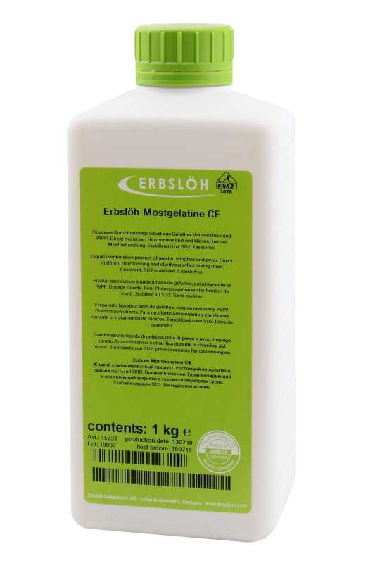 Vyhody registrácieErbslöh Mostgelatine CF spôsobuje redukciu celkových polyfenolov a podporuje sedimentáciu. Vďaka bezkazínovej výrobe nie je povinnosť vyznačovať alergény na etikete. Najmä pri vyššej mechanickej záťaži suroviny, dlhšiu maceráciu rmutu alebo ostatná záťaž rmutu, je použitie Erbslöh Mostgelatine CF zmysluplné. Hlavnou zložkou je kvapalná želatína, vyzina a krížovo zosieťovaný polyvinylpolypyrrolidon.