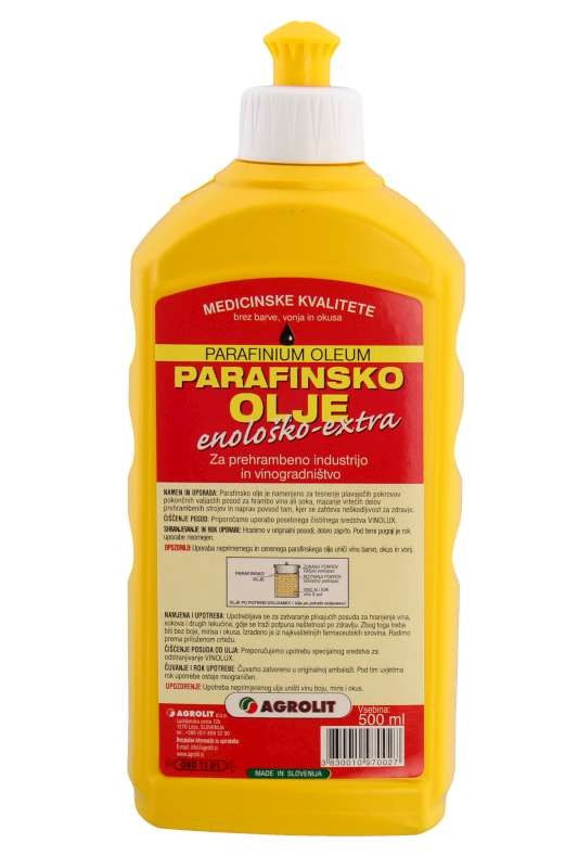 Vyhody registrácieParafínový olej pre potravinárske použitie a vinárstva. Lekárska kvalita. Používa sa na utesnenie plávajúcich viek k tomu prispôsobených nerezových sudov na uchovávanie vína a ovocných štiav, na mazanie rotujúcich súčastí potravinárskych strojov a všade tam kde je nutná zdravotná nezávadnosť. Olej sa vlieva do priestoru medzi plávajúcim vekom a stenou suda až po vrchnú hranu plávajúceho veka. Pre nádrž 50L sa dávkuje cca 2dcl podľa priemeru nádrže.
