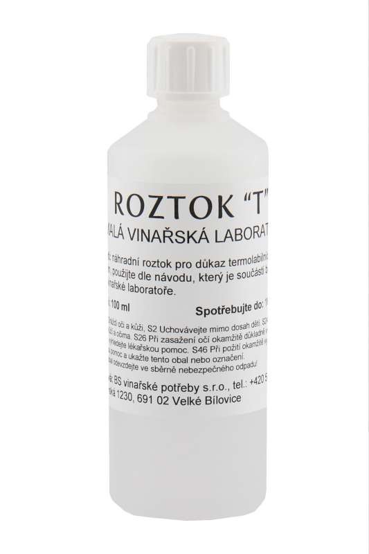 Vyhody registrácieRoztok T - určený na dôkaz prítomnosti termo labilných bielkovín vo víne. Produkt je možné kúpiť samostatne alebo v rámci Súpravy na analýzu vín.