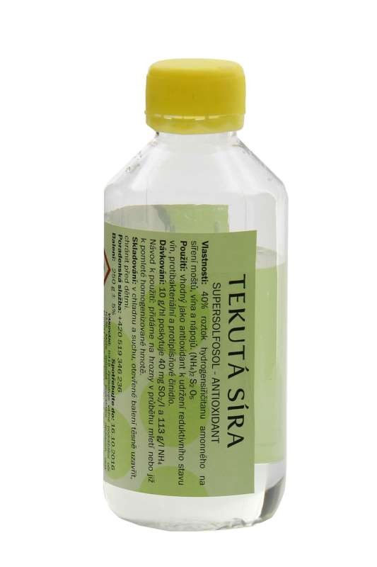 Vyhody registrácieSupersolfosol - antioxidant 40% roztok hydrogensiričitanom amónneho na sírenie muštov, vína a nápojov. Vhodný ako antioxidant k udržaniu reduktívneho stavu vín, proti bakteriálne a protiplesňové činidlo.