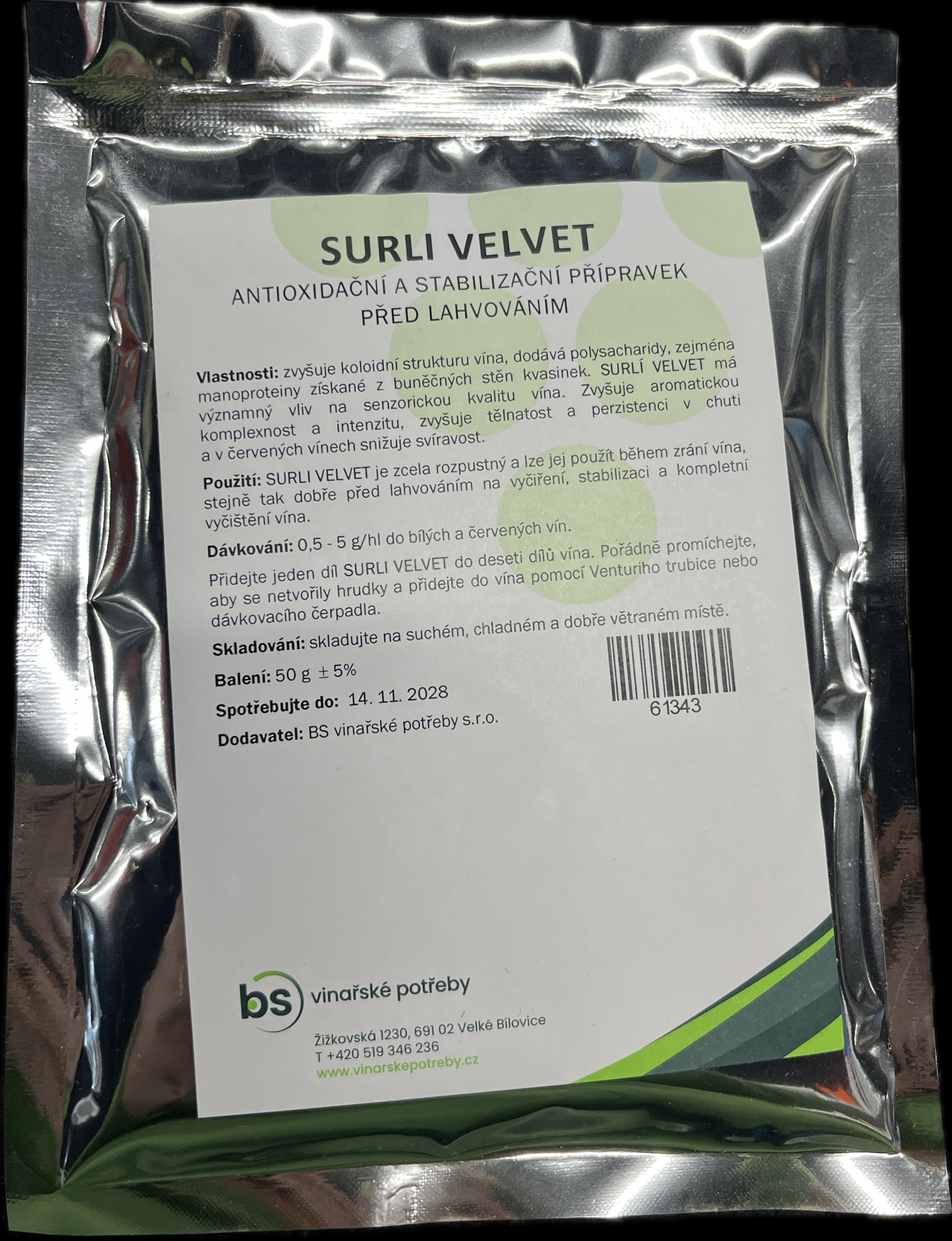 Použitie: pridajte jeden diel surly VELVET do desiatich dielov vína. Poriadne premiešajte, aby sa netvorili hrudky a pridajte do vína pomocou Venturiho trubice alebo dávkovacieho čerpadla.