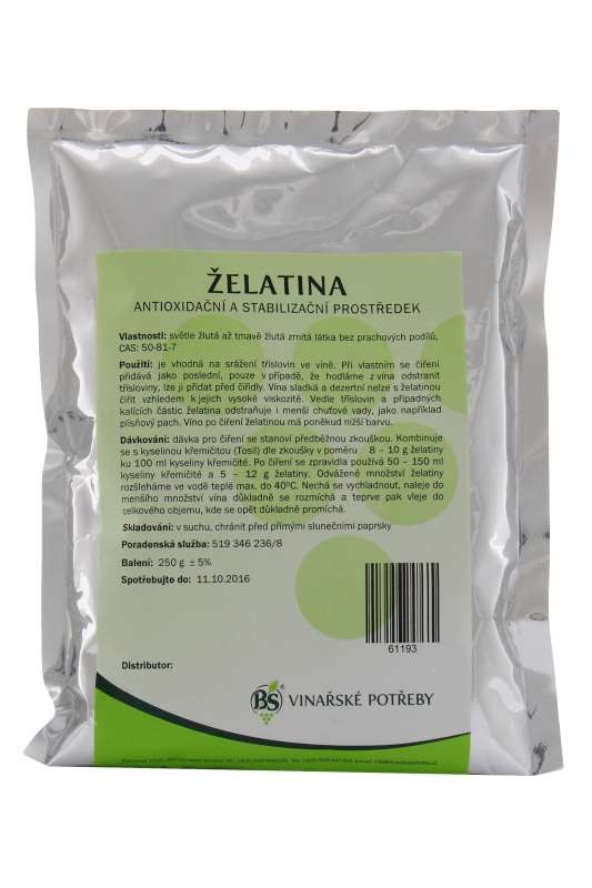 Vyhody registrácieJe vhodná na zrážanie trieslovín vo víne. Pri vlastnom čírení sa pridáva ako posledná, len v prípade, že chceme z vína odstrániť triesloviny, možno ju pridať pred použitím číridiel. Pre vína sladké a dezertné, nemožno číriť s želatínou vzhľadom k ich vysokej viskozite. Vedľa trieslovín a prípadných kalných častíc, želatína odstraňuje aj menšie chuťové vady, ako napríklad plesňový pach. Víno po čírení želatínou má trochu nižšiu farbu.