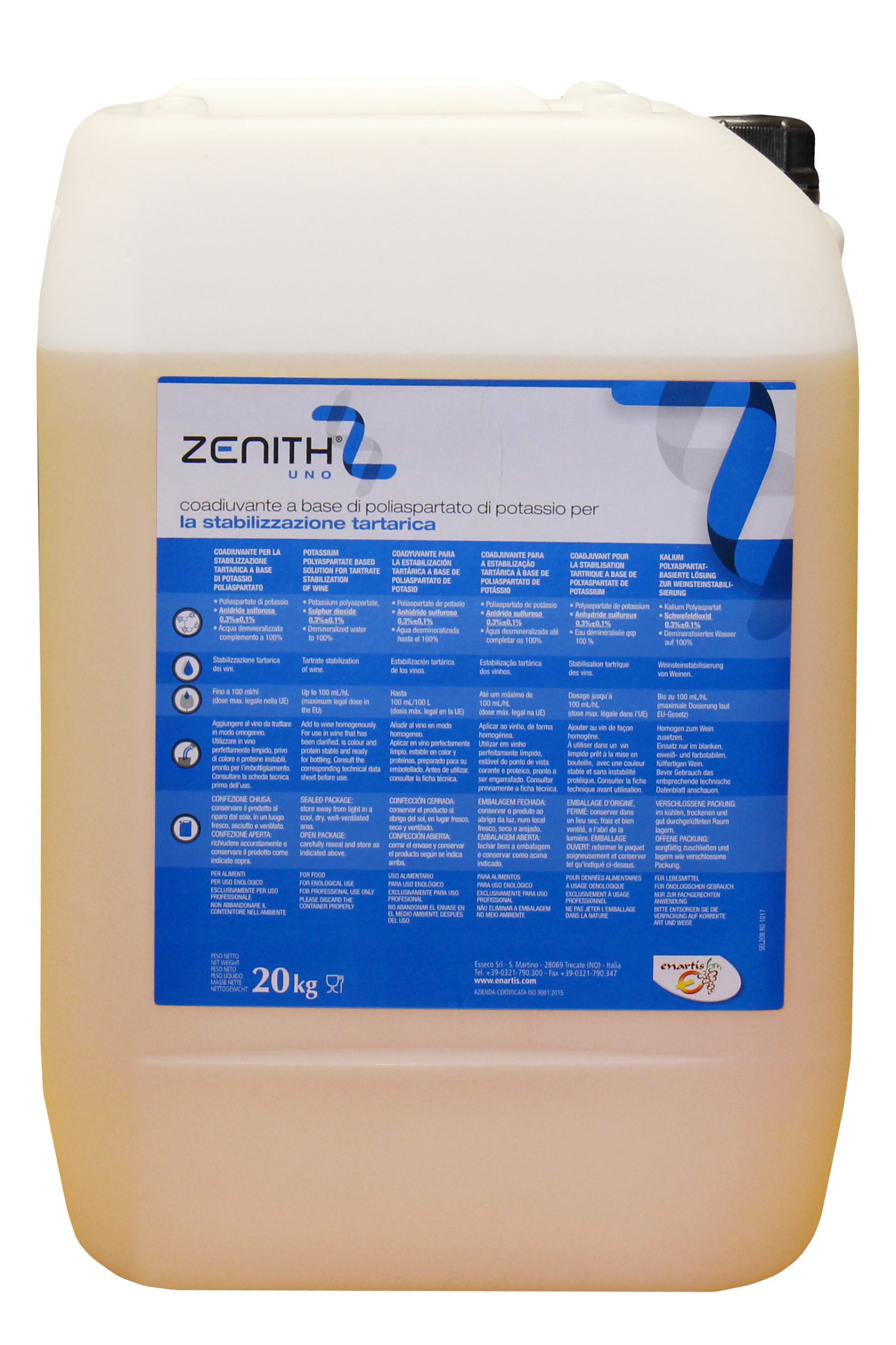 Použitie: ZENITH UNO je účinný, rýchly a ľahko použiteľný pre stabilizáciu vínneho kameňa (hydrogénvínanom draselného) vo víne. Menšie riziko oxidácie, lepšie zachovanie aromatických látok, farby a štruktúry, žiadny vplyv na senzorický profil vína. • môže byť použitý k stabilizácii veľmi nestabilných vín. • zaisťuje dlhodobý stabilizačný účinok. Neovplyvňuje filtrovateľnosť vína. Nereaguje s farebnými zložkami v červenom víne. Je odolný voči vysokým teplotám, preto môže byť použitý pri stabilizácii vín podrobených pasterizáciu.